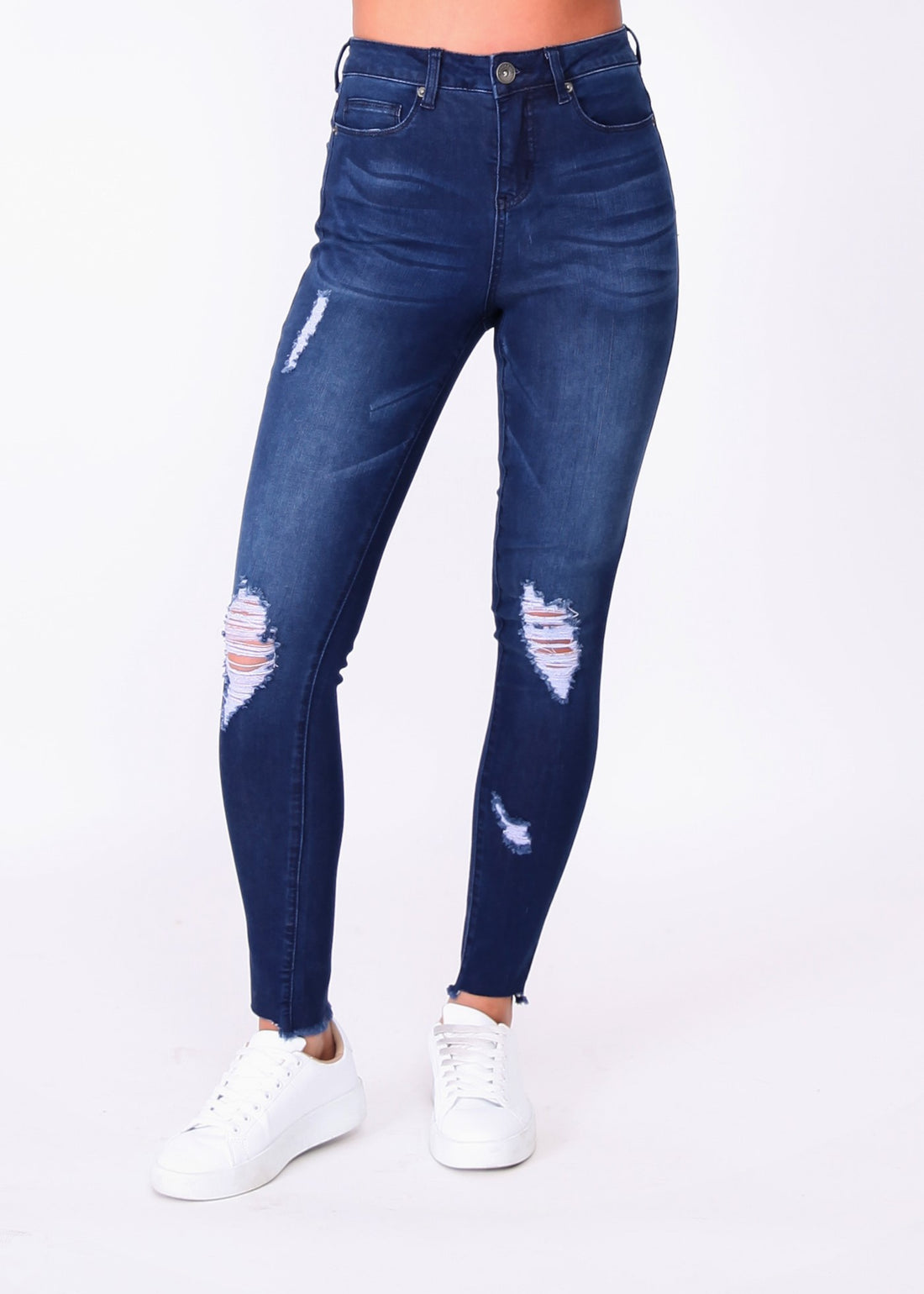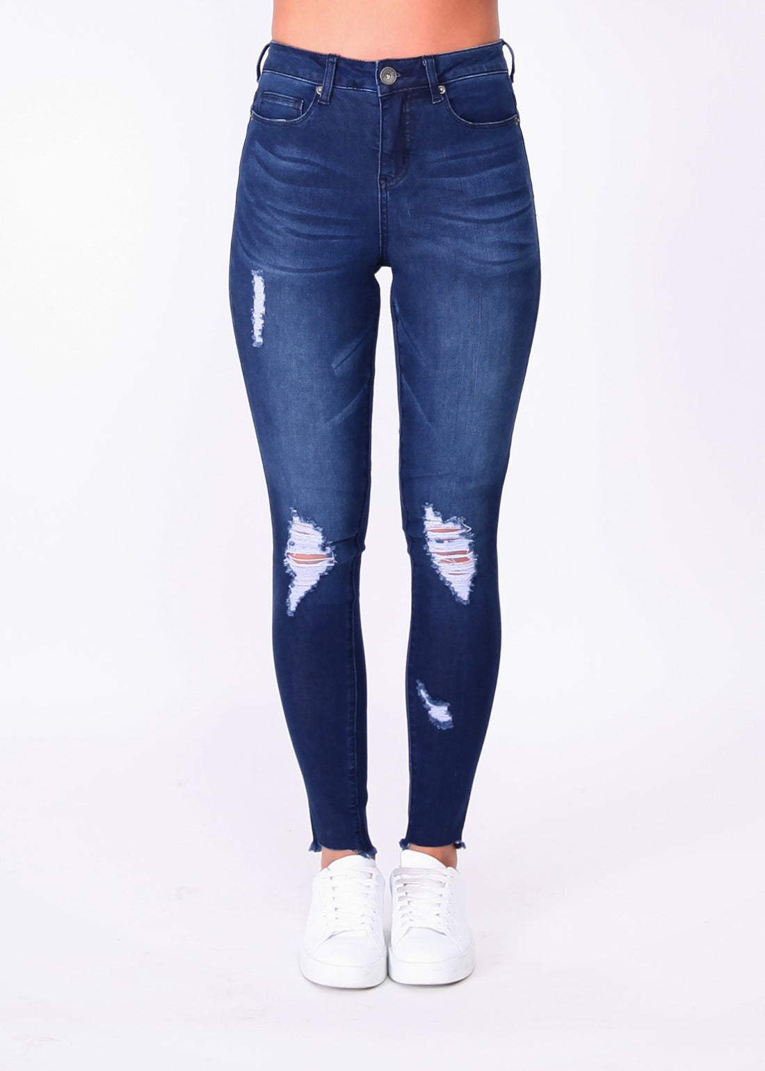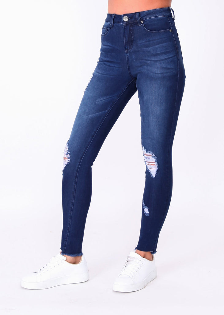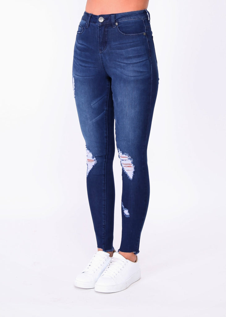 We love the raw edge on the hem of our Kim Ripped Skinny Jeans. They sit beautifully with a pair of white sneakers for an edgy daytime look. The ripped knees are super on-trend and you can't beat that high-waisted finish for a flattering silhouette.
